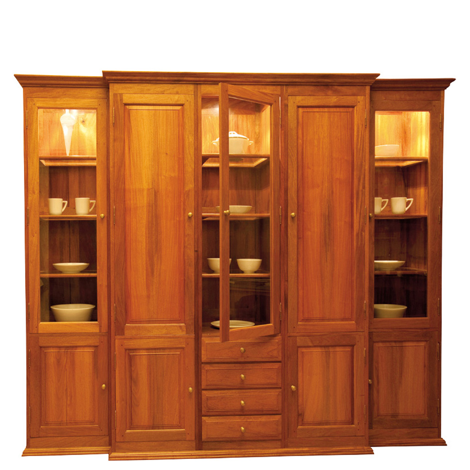 Dieser klassisch schöne Wohnzimmerschrank mit teils geschlossenen, teils verglasten Elementen, ist in verschiedenen Hölzern lieferbar.