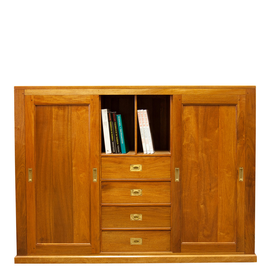 Unter den vier geräumigen und leichtlaufenden Schubladen befinden sich vier offene Fächer, in denen Sie wunderbar Bücher, Vasen & Skulpturen, oder andere Dekorationsgegenstände präsentieren können.
